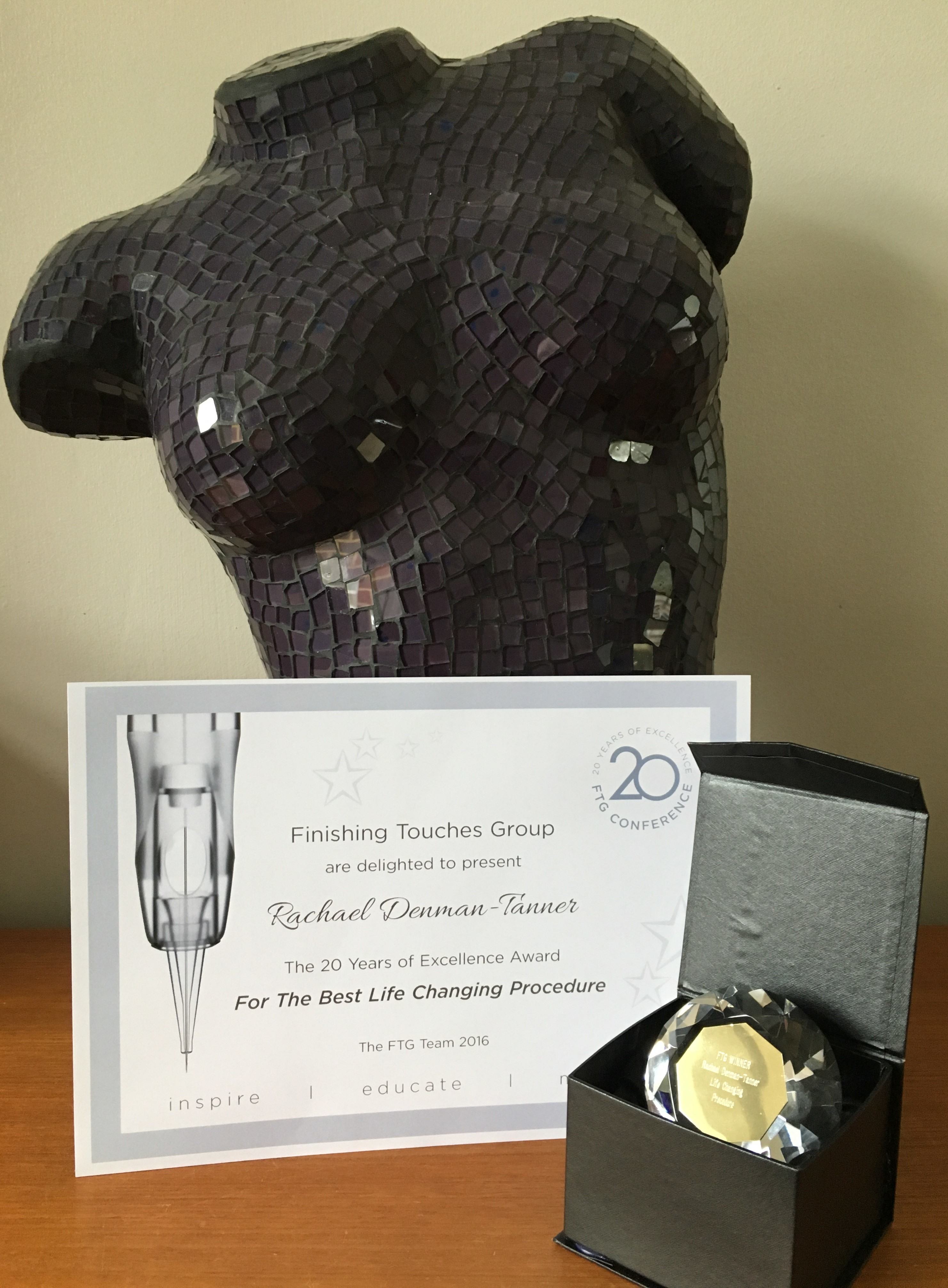 I’m delighted to accept this award for the Best Life Changing Procedure (Medical Tattooing), presented by The Finishing Touches Group. My two entries were regarding nipple/areola tattooing and scalp tattooing, both of which were truly life changing for both of these clients.